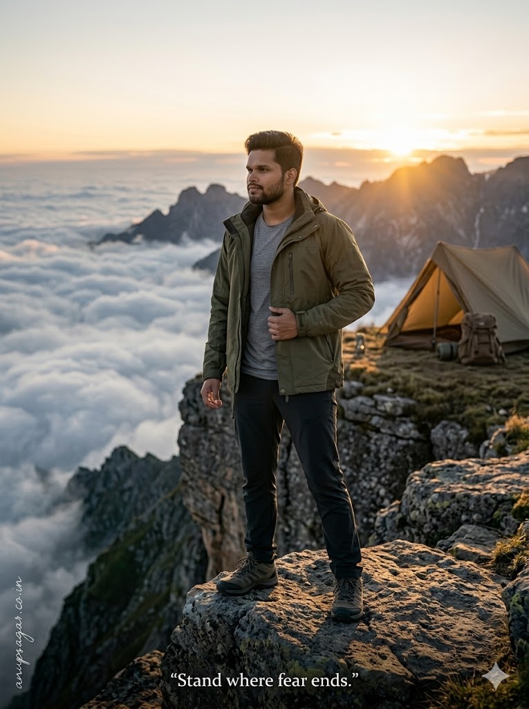 Keep my face 100% same as in the reference image. FACE MATCHING INSTRUCTIONS Face must remain exactly same as reference image — no face change, no reshaping, no beautification. Preserve exact facial identity, pores, texture, and natural expression. Face must look completely real and human. FACE CLARITY — ULTRA HD NATURAL DETAIL Face must be EXTREME ultra-HD, crystal-clear, razor sharp with visible pores, natural skin texture, and realistic highlights. No artificial smoothing or glow. Ultra-realistic cinematic outdoor camping photograph, 8K DSLR quality, extremely sharp focus, zero blur, hyper-realistic textures, natural lighting realism. ASPECT RATIO • 3:4 vertical SCENE A dramatic mountain cliff camping location during sunrise. Clouds floating below, golden sunlight hitting peaks, creating epic cinematic depth. SUBJECT A young man standing near the edge of a cliff beside a small camping setup. FACE & LOOK DETAILS Young male, natural skin tone, visible pores, slight beard. Face illuminated by soft golden sunrise light. POSE DETAILS The Edge Confidence Pose (Standing tall with one foot slightly forward near edge, hands relaxed or one hand holding jacket edge, body facing horizon, strong natural posture) OUTFIT DETAILS Outdoor jacket, t-shirt, trekking pants, hiking boots. Realistic fabric folds and textures. BACKGROUND DETAILS Mountain peaks, clouds below, wide open sky. Sun rising behind mountains. PROPS DETAILS Camping tent behind subject. Backpack and trekking gear placed nearby. LIGHTING DETAILS Golden sunrise light creating rim glow around subject. Soft shadows and highlights across face and outfit. Balanced natural exposure. CAMERA & COMPOSITION Full-body cinematic shot. Subject slightly off-center. Slight low angle for heroic feel. 50mm lens look. Ultra sharp focus on face and subject (NO blur). STYLE Hyper-realistic cinematic adventure photography. Warm + cool mixed tones with epic depth. EXPRESSION DETAILS Strong, calm, confident expression. TEXT DETAILS Bottom center text: “Stand where fear ends.” FACE RULES Face must remain 100% identical and natural. No smoothing, no beautification, no AI look. NEGATIVE PROMPT blur, CGI, cartoon, distortion, over-smooth skin, low quality TEXT / SIGNATURE Add “anupsagar.co.in” at the bottom-left corner, HANDWRITTEN SIGNATURE-STYLE typography, thin cursive strokes, small size, subtle premium elegance, white or soft off-white color.