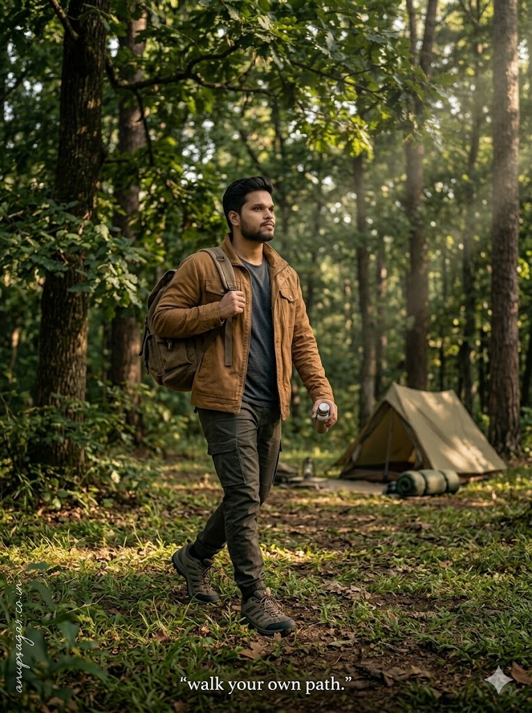 Keep my face 100% same as in the reference image. FACE MATCHING INSTRUCTIONS Face must remain exactly same as reference image — no face change, no reshaping, no beautification. Preserve exact facial identity, pores, texture, and natural expression. Face must look completely real and human. FACE CLARITY — ULTRA HD NATURAL DETAIL Face must be EXTREME ultra-HD, razor sharp, crystal-clear with visible pores, natural skin imperfections, and realistic highlights. No artificial smoothing or glow. Ultra-realistic cinematic outdoor camping photograph, 8K DSLR quality, extremely sharp focus, zero blur, hyper-realistic textures, natural lighting realism. ASPECT RATIO • 3:4 vertical SCENE Dense green forest camping environment during late afternoon. Sunlight filtering through trees creating light rays and shadow patterns on ground. SUBJECT A young man walking casually near campsite in a natural lifestyle moment. FACE & LOOK DETAILS Young male, natural skin tone, visible pores, slight beard. Face softly lit by filtered sunlight. POSE DETAILS The Natural Walk Pose (Walking slowly with one foot forward, body relaxed, one hand holding a small item like bottle or gear, other hand swinging naturally, natural motion captured) OUTFIT DETAILS Outdoor jacket (green/brown tone), t-shirt, cargo pants, hiking shoes. Realistic fabric folds and textures. BACKGROUND DETAILS Tall trees, dense foliage, sunlight rays through leaves. Ground covered with grass, leaves, and soil. PROPS DETAILS Backpack on shoulder. Minimal camping gear visible in background (tent or bag). LIGHTING DETAILS Natural sunlight filtering through trees. Soft light rays creating cinematic highlights. Balanced natural shadows across subject. CAMERA & COMPOSITION Wide cinematic shot. Subject slightly off-center. Eye-level or slight low angle. 50mm lens look. Ultra sharp focus on face and body (NO blur). STYLE Hyper-realistic outdoor lifestyle photography. Natural green color grading with cinematic depth. EXPRESSION DETAILS Relaxed, natural, slightly focused expression. TEXT DETAILS Bottom center text: “walk your own path.” FACE RULES Face must remain 100% identical and natural. No smoothing, no beautification, no AI look. NEGATIVE PROMPT blur, motion blur, CGI, cartoon, distortion, over-smooth skin, low quality TEXT / SIGNATURE Add “anupsagar.co.in” at the bottom-left corner, HANDWRITTEN SIGNATURE-STYLE typography, thin cursive strokes, small size, subtle premium elegance, white or soft off-white color.