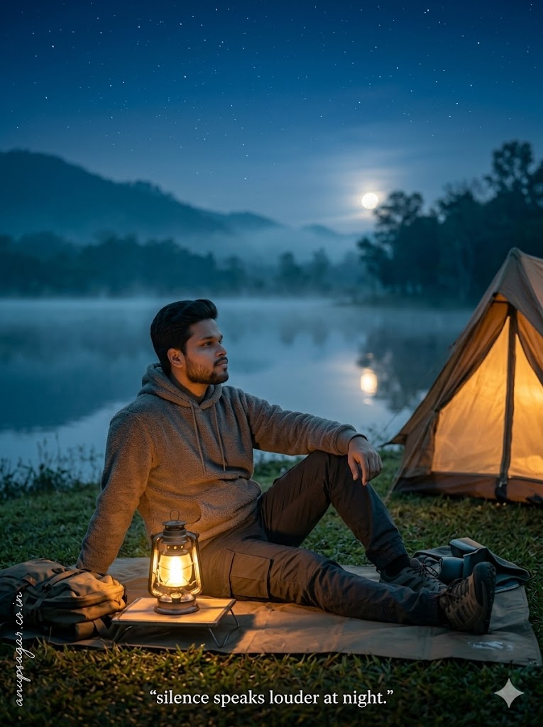 Keep my face 100% same as in the reference image. FACE MATCHING INSTRUCTIONS Face must remain exactly same as reference image — no face change, no reshaping, no beautification. Preserve exact facial identity, pores, texture, and expression. Ultra-realistic cinematic outdoor camping photograph, 8K DSLR quality, extremely sharp focus, zero blur, no artificial smoothing, no CGI look, hyper-realistic textures, natural lighting realism. ASPECT RATIO • 3:4 vertical SCENE A quiet night camping scene near a lake with deep blue sky and faint stars. A glowing tent softly illuminating the surroundings. Slight fog over water creating cinematic depth. SUBJECT A young man sitting outside a tent in a relaxed night camping vibe. FACE & LOOK DETAILS Young male, natural skin texture with visible pores. Face lit softly from warm tent light. Calm peaceful expression. POSE DETAILS The Night Chill Lean Pose (Sitting on ground or mat leaning slightly back using one arm for support, one leg stretched and other bent, looking toward horizon or slightly upward, relaxed body posture) OUTFIT DETAILS Dark hoodie or jacket, casual pants, sneakers. Slight texture visible under soft light. BACKGROUND DETAILS Lake reflecting faint moonlight. Mountains and trees fading into dark. Night sky with subtle stars. PROPS DETAILS Camping tent glowing warmly from inside. Lantern placed near subject. Small backpack or camping gear around. LIGHTING DETAILS Cool blue ambient night light overall. Warm yellow/orange glow from tent lighting face softly. Balanced cinematic contrast between warm and cool tones. CAMERA & COMPOSITION Wide cinematic frame. Subject placed slightly to one side. Eye-level angle. 50mm lens look. Ultra sharp focus on face and subject (NO blur). STYLE Cinematic outdoor night photography, moody lifestyle aesthetic. Teal & orange color grading with soft contrast. EXPRESSION DETAILS Peaceful, introspective, calm mood. TEXT DETAILS Bottom center text: “silence speaks louder at night.” FACE RULES Face must remain 100% identical and natural. No smoothing, no beautification, no AI look. NEGATIVE PROMPT blur, motion blur, CGI, cartoon, distortion, over-smooth skin, low quality TEXT / SIGNATURE Add “anupsagar.co.in” at the bottom-left corner, HANDWRITTEN SIGNATURE-STYLE typography, thin cursive strokes, small size, subtle premium elegance, white or soft off-white color.