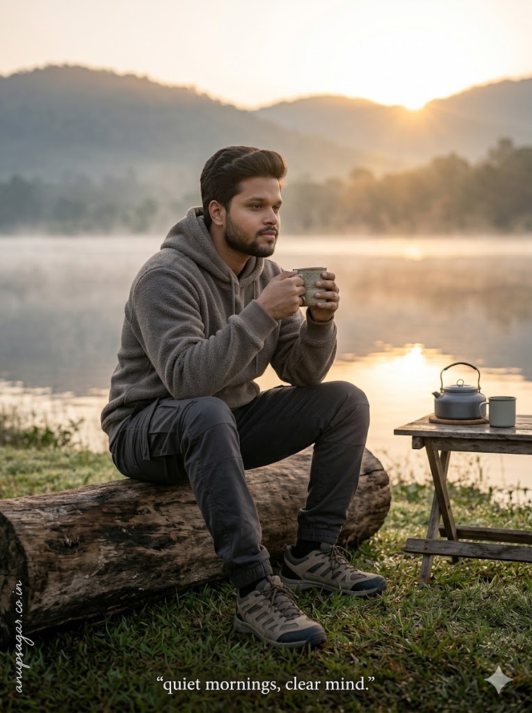Keep my face 100% same as in the reference image. FACE MATCHING INSTRUCTIONS Face must remain exactly same as reference image — no face change, no reshaping, no beautification, no AI modification. Preserve real skin texture, pores, facial structure, hairstyle, and natural expression exactly. Face must look fully human and natural. FACE CLARITY — ULTRA HD NATURAL DETAIL Face must be EXTREME ultra-HD, crystal-clear, razor sharp with visible pores, natural skin texture, and realistic highlights. No smoothing, no artificial glow, no plastic skin. Ultra-realistic cinematic outdoor camping photograph, 8K DSLR quality, extremely sharp focus, zero blur, hyper-realistic textures, natural lighting realism. ASPECT RATIO • 3:4 vertical SCENE Early morning camping beside a calm lake during sunrise. Soft mist floating over water, golden sunlight slowly rising behind hills creating peaceful cinematic depth. SUBJECT A young man sitting quietly enjoying morning coffee beside a camp setup. FACE & LOOK DETAILS Young male, natural skin tone, slight beard, soft relaxed face. Face gently lit by warm sunrise light. POSE DETAILS The Morning Coffee Calm Pose (Sitting on a camping stool or wooden log, slightly leaning forward, holding a cup with both hands near chest, elbows relaxed on knees, natural relaxed posture) OUTFIT DETAILS Soft fleece jacket or hoodie, comfortable jogger pants, casual sneakers. Natural folds and textures visible. BACKGROUND DETAILS Lake surface reflecting sunrise light. Soft mist floating over water. Hills fading into distance with warm glow. PROPS DETAILS Small camping table with kettle, cup, and basic gear. Minimal setup to keep clean aesthetic. LIGHTING DETAILS Warm golden sunrise light illuminating face softly. Cool ambient mist light balancing tones. Natural soft shadows, no harsh contrast. CAMERA & COMPOSITION Medium-wide cinematic shot. Subject slightly off-center. Eye-level angle. 50mm realistic lens look. Ultra sharp focus on face and subject (NO blur). STYLE Hyper-realistic cinematic lifestyle photography. Soft warm color grading with natural tones. Highly detailed textures in skin, fabric, and environment. EXPRESSION DETAILS Peaceful, calm, natural morning vibe. TEXT DETAILS Bottom center text: “quiet mornings, clear mind.” FACE RULES 100% natural face. No smoothing, no beautification, no AI artifacts. NEGATIVE PROMPT blur, soft focus, CGI, cartoon, over-smooth skin, distortion, low resolution TEXT / SIGNATURE Add “anupsagar.co.in” at the bottom-left corner, HANDWRITTEN SIGNATURE-STYLE typography, thin cursive strokes, small size, subtle premium elegance, white or soft off-white color.