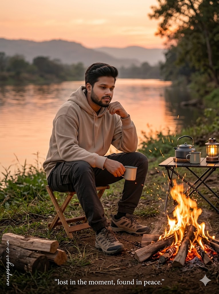 Keep my face 100% same as in the reference image. FACE MATCHING INSTRUCTIONS Face must remain exactly same as reference image — no face change, no reshaping, no beautification, no AI modification. Preserve real skin texture, pores, facial structure, hairstyle, and expression exactly. Ultra-realistic cinematic outdoor camping photograph, 8K DSLR quality, extremely sharp focus, zero blur, no artificial smoothing, no CGI look, no cartoon effect, hyper-realistic textures, natural lighting realism. ASPECT RATIO • 3:4 vertical SCENE A peaceful sunset camping setup beside a calm riverside with golden sunlight reflecting on water. Sky filled with warm orange and pink tones. Trees and soft hills visible in background. SUBJECT A young man sitting near a campfire in a relaxed lifestyle pose. FACE & LOOK DETAILS Young male, natural skin texture with visible pores, slight beard. Face slightly turned toward fire light, calm relaxed expression. POSE DETAILS The Relaxed Firewatch Pose (Sitting comfortably on a low camping stool or log, one elbow resting on knee, one hand loosely holding a cup, body slightly leaned forward toward fire, natural relaxed posture) OUTFIT DETAILS Oversized hoodie (earth tone or beige), dark cargo pants, rugged sneakers. Natural folds and texture visible. BACKGROUND DETAILS River water glowing under sunset light. Trees and hills softly fading into distance. Natural outdoor textures (grass, soil). PROPS DETAILS Campfire with glowing flames and sparks. Wood logs placed around. Small camping table with kettle, mug, and lantern. LIGHTING DETAILS Warm golden sunset light from background. Strong warm orange light from campfire illuminating face and body. Soft ambient natural light blending both tones. CAMERA & COMPOSITION Wide cinematic shot. Subject slightly off-center. Eye-level slightly low angle. 50mm realistic lens look. Ultra sharp focus on subject and fire (NO blur). STYLE Hyper-realistic cinematic outdoor lifestyle photography. Warm cinematic color grading (orange, gold, natural tones). Highly detailed textures in fire, clothing, and environment. EXPRESSION DETAILS Calm, peaceful, slightly thoughtful vibe. TEXT DETAILS Bottom center minimal text: “lost in the moment, found in peace.” FACE RULES 100% natural face. No smoothing, no beautification, no AI artifacts. NEGATIVE PROMPT blur, motion blur, CGI, cartoon, over-smooth skin, distortion, low resolution TEXT / SIGNATURE Add “anupsagar.co.in” at the bottom-left corner, HANDWRITTEN SIGNATURE-STYLE typography, thin cursive strokes, small size, subtle premium elegance, white or soft off-white color.