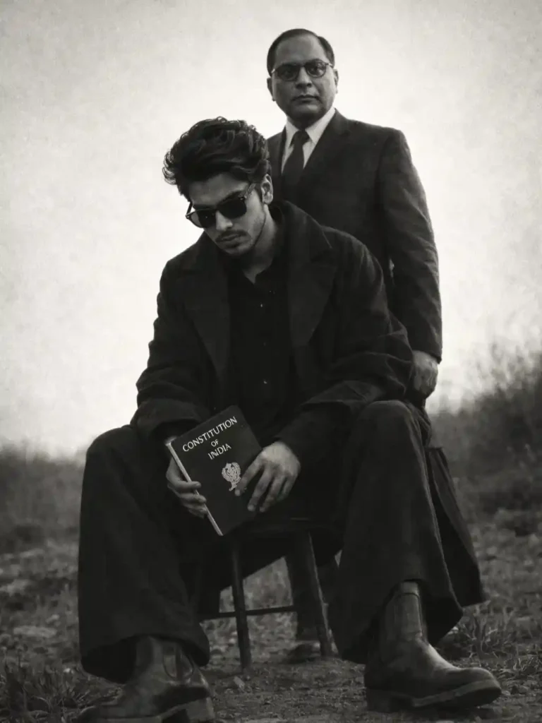 1080p high-quality cinematic photograph. Medium-format monochrome fine-art fashion editorial with subtle film grain and matte texture. Subject seated low on a minimalist metal stool, legs extended forward in a relaxed grounded pose, feet on uneven outdoor terrain. One hand loosely between the knees holding the Indian Constitution, shoulders slightly slouched, head gently tilted downward with a calm, introspective expression. Dark oversized layered outfit, wide-leg trousers, leather boots, dark sunglasses. Behind the seated figure stands Dr. Babasaheb Ambedkar, strong presence, closely aligned in a protective stance, partially overlapping the silhouette. Open natural landscape with rough ground and wild grass; bright overexposed sky forming strong negative space. High contrast lighting, deep blacks, soft highlights, timeless cinematic mood.