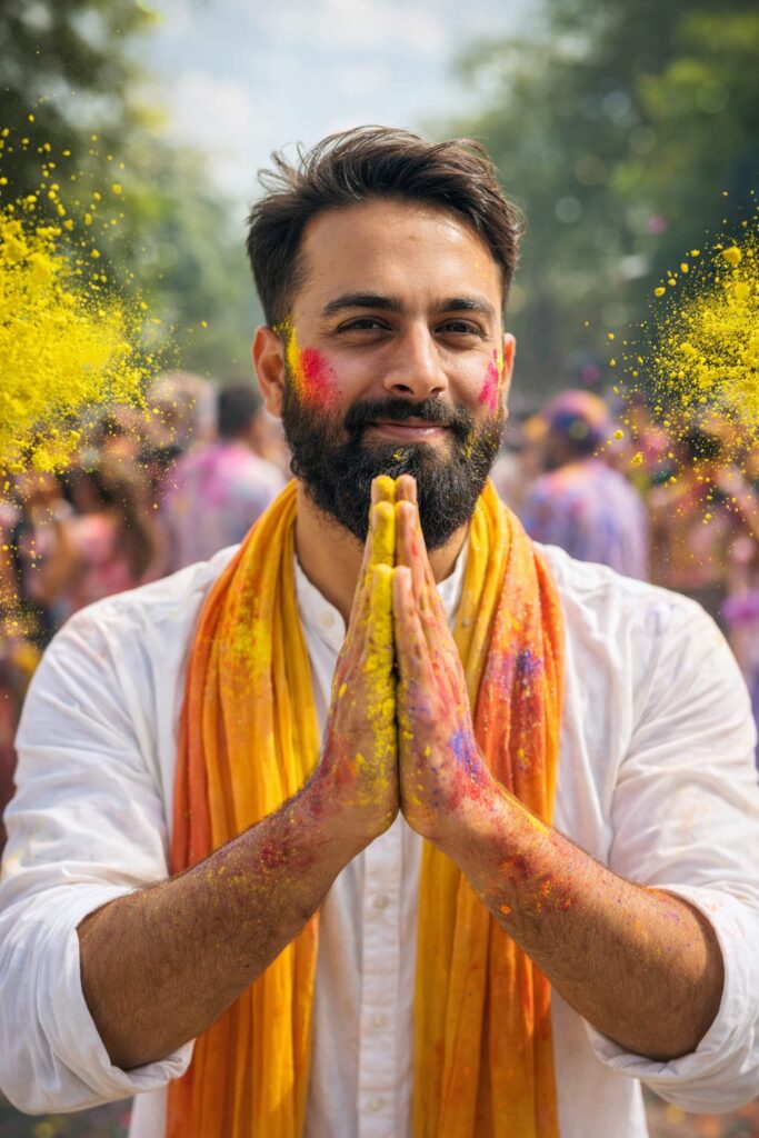 A realistic young man with a clean, natural-looking face, slightly smiling and posing in a fun, confident style while joining both hands together in a greeting gesture. He is wearing a fitted white shirt and a long stole around his neck. He is playing Holi, holding bright yellow gulal in both hands, with colored powder already smeared on his hands. Yellow gulal is flying in the air on both sides, creating a dynamic festive atmosphere. The background shows people playing Holi in soft focus, with cinematic lighting, natural daylight, vibrant colors, and realistic skin texture. Ultra HD quality, sharp details, clean face, professional photography, shallow depth of field, high realism, 4K resolution. Don’t change faces