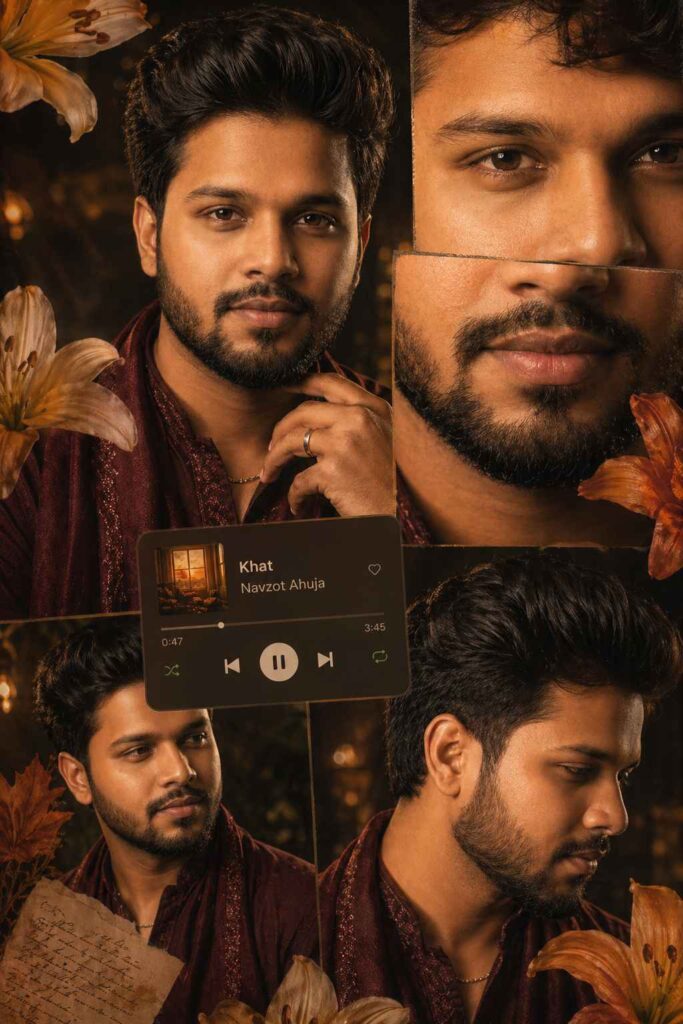 A warm-toned cinematic portrait collage of a young man with clear glowing skin, natural texture, and subtle facial details. He has thick dark hair styled in soft waves or a slightly messy textured look, with a few strands falling naturally on the forehead. His expression is calm and confident, with softly defined lips and sharp yet natural facial features.