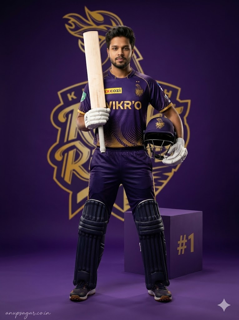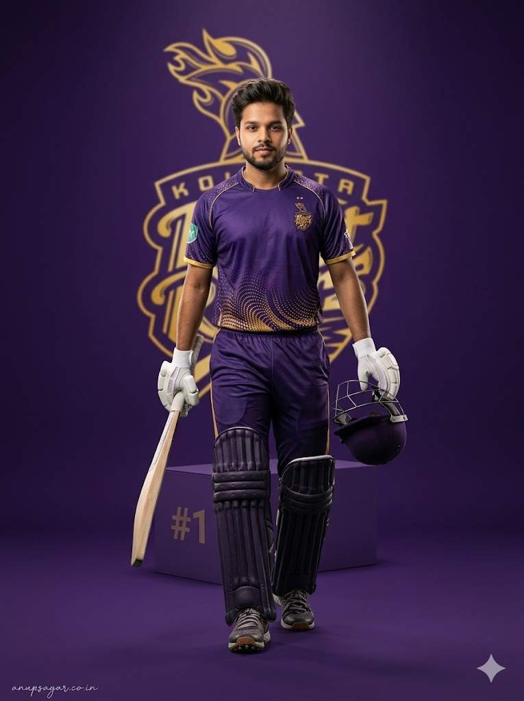 Create an ultra-realistic cinematic DSLR photograph recreating the SAME cricket-themed environment but now themed for KKR (Kolkata Knight Riders) in a NEW standing command pose, maintaining full-body visibility including shoes and seamless background-floor color matching, with ZERO AI or edited appearance. The subject is an 18-year-old handsome young man with a slim, lean physique, narrow shoulders and waist. His face remains EXACTLY identical—no modification in facial structure, pores, skin texture, beard, or identity. Hairstyle is strictly consistent: modern textured side-swept quiff with heavy natural volume, messy controlled strands, matte finish, softly blended sides (NO fade). FRAMING & CAMERA: Full-body shot (head to shoes fully visible), vertical composition, slightly low angle using a 50mm cinematic lens for a powerful dominant perspective. ASPECT RATIO • 3:4 vertical POSE (NEW – BAT COMMAND POSE): Standing upright with legs slightly apart and stable. Cricket bat held vertically in front of body with one hand gripping the top of the handle. Other hand holding helmet slightly away from body near thigh. Body facing forward with slight angle, shoulders squared and chest open. Feet fully visible and firmly grounded. EXPRESSION: Serious composed expression with strong leadership aura, eyes fixed directly at camera. OUTFIT (KKR THEME): — Deep purple KKR jersey with gold accents and ultra-realistic fabric texture — Matching purple trousers extending to ankles with natural folds — White batting gloves — Dark cricket pads fully visible — Cricket shoes (white/purple) clearly visible with detailed sole grip PROPS: — Bat vertical with visible wood grain — Helmet held naturally with metallic reflections — Full cricket gear ultra-detailed BOX (NO GLOW – MINIMAL PRESENCE): — Matte purple box placed slightly behind subject — Subtle white “#1” marking — Natural shadow beneath BACKGROUND + FLOOR (MATCHED COLOR): — Deep purple cinematic background — Floor EXACT SAME tone (seamless, no visible line) — Matte surface with soft shadows — Large KKR logo behind subject (slightly blurred for depth) LIGHTING: — Soft key light illuminating entire body evenly — Slight top light for depth — Rim light outlining subject edges — Balanced cinematic shadows COLOR GRADING: Rich purple-gold cinematic tones with strong contrast and depth. DEPTH OF FIELD: Subject ultra sharp from head to shoes, background softly blurred. FACE CLARITY — ULTRA HD MICRO DETAIL Face must be ultra-HD, razor sharp, crystal-clear with visible pores and exact identity preservation. STYLE Cinematic cricket poster, ultra-realistic DSLR photography, leadership aesthetic. IMPORTANT HARD RULE Must look like real photograph. NO AI artifacts. NEGATIVE PROMPT face change, blur face, CGI, cartoon, extra limbs, bad anatomy, low resolution TEXT / SIGNATURE Add “anupsagar.co.in” at the bottom-left corner, HANDWRITTEN SIGNATURE-STYLE typography, thin cursive strokes, small size, subtle premium elegance, white or soft off-white color.