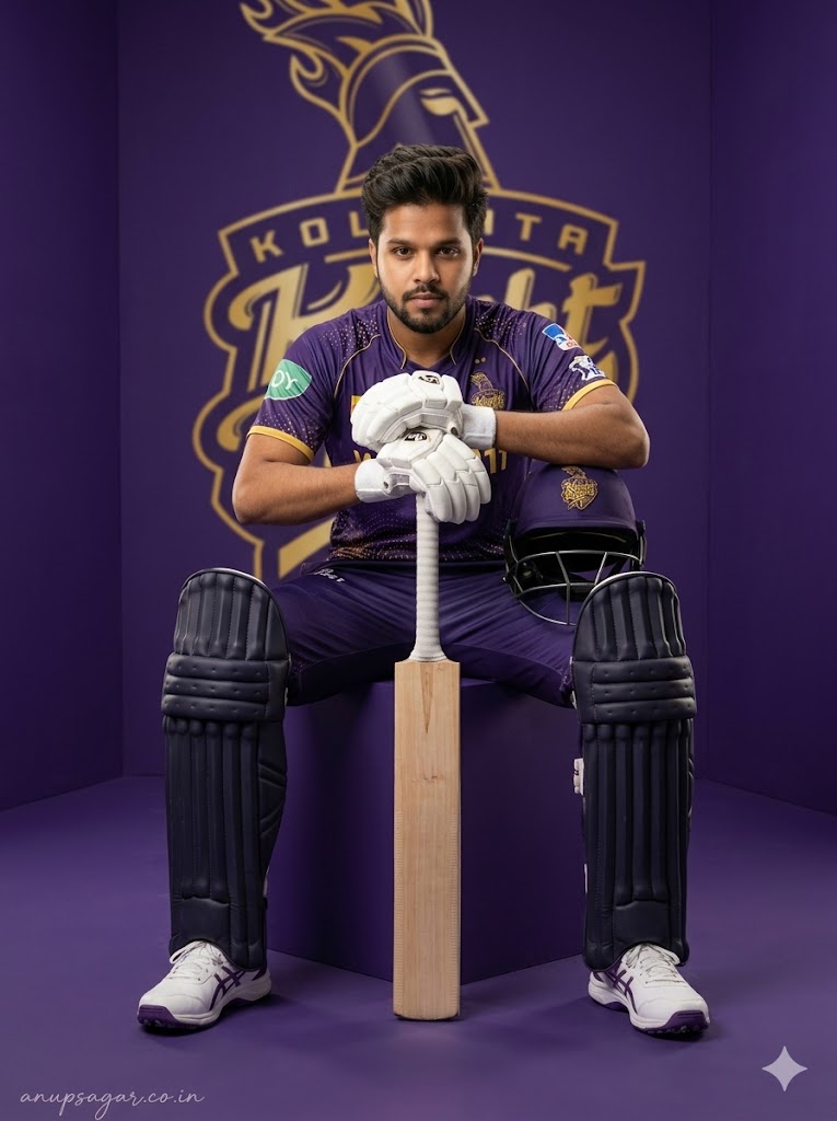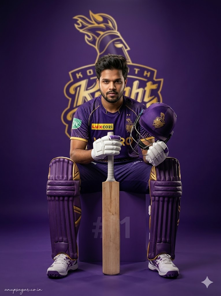 Create an ultra-realistic cinematic DSLR photograph recreating the SAME cricket-themed composition but now themed for KKR (Kolkata Knight Riders), with full-body visibility including shoes and seamless background-floor color matching, maintaining exact realism and ZERO AI or edited appearance. The subject is an 18-year-old handsome young man with a slim, lean physique. His face remains EXACTLY identical—no modification allowed. Hairstyle remains the same textured side-swept quiff with natural strands and volume. FRAMING & CAMERA: Full-body shot, vertical composition, slight side-angle using a 50mm cinematic lens for a premium editorial feel. ASPECT RATIO • 3:4 vertical POSE (NEW – SIDE-SEATED ROYAL POSE): Subject seated slightly sideways on the box. One leg slightly forward, the other relaxed, both feet fully visible. Cricket bat resting diagonally across lap held casually with one hand. Helmet placed beside or lightly held in the other hand. Body angled but face directed toward camera. EXPRESSION: Calm confident expression with slight smirk, stylish and composed athlete vibe. OUTFIT (KKR THEME): — Deep purple KKR jersey with gold detailing — Matching trousers with natural folds — White gloves — Full cricket pads visible — Cricket shoes clearly visible with texture and grip PROPS: — Bat across lap with visible wood grain — Helmet placed beside subject — All gear ultra-realistic BOX (NO GLOW): — Matte purple box — Subtle white “#1” — Natural shadow beneath BACKGROUND + FLOOR (MATCHED COLOR): — Deep purple cinematic background — Seamless floor matching tone — Large KKR logo centered behind (slight blur) LIGHTING: — Soft front key light — Slight top light — Rim light for separation — Smooth cinematic shadow falloff COLOR GRADING: Cinematic purple-gold tones with rich contrast and depth. DEPTH OF FIELD: Subject fully sharp, background slightly blurred. FACE CLARITY — ULTRA HD MICRO DETAIL Face must be ultra-HD, crystal-clear with visible pores and exact identity match. STYLE Cinematic sports + fashion editorial poster, ultra-realistic DSLR look. IMPORTANT HARD RULE Must look 100% real human photograph. NEGATIVE PROMPT face distortion, blur face, CGI, cartoon, extra limbs, wrong anatomy, low quality TEXT / SIGNATURE Add “anupsagar.co.in” at the bottom-left corner, HANDWRITTEN SIGNATURE-STYLE typography, thin cursive strokes, small size, subtle premium elegance, white or soft off-white color.