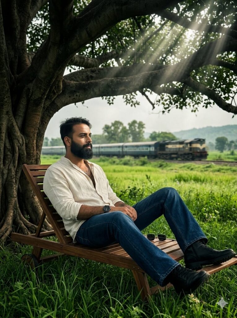 Ultra-realistic cinematic shot of a young man with a distinct, clear face sitting on a long reclining chair under a massive ancient tree in a vast open field. He is wearing a stylish free-size shirt, bootcut jeans, a sleek watch, and black boots. In the background, a train is passing by, creating a sense of motion. The ground is covered in lush, vibrant green grass. The photo is captured from a side-angle view with a shallow depth of field. The background is slightly dark and moody, while the man’s face is illuminated with sharp, ultra-HD cinematic lighting. 8k resolution, photorealistic, highly detailed skin texture, 3:4 aspect ratio. Don’t change faces