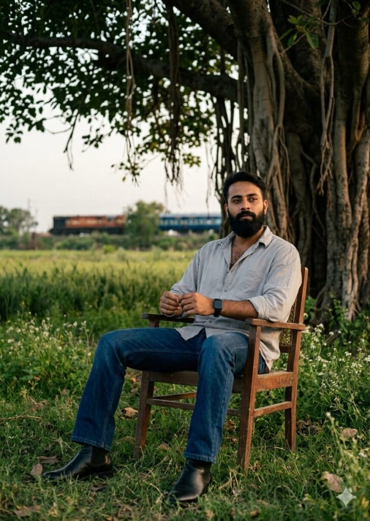 A realistic, full-body portrait photograph captures a confident young man in his late 20s with short, dark hair and a light stubble, sitting casually and relaxing under a large, leafy banyan tree in an open rural field at dusk. He is leaning against a rustic, high-backed wooden chair, angled slightly towards the camera, looking forward with a relaxed, confident expression. He is wearing a loose-fitting, free-size light grey cotton shirt, dark blue bootcut jeans, and black leather boots. A black watch is visible on his left wrist. The background features a green field with small, natural grasses and wildflowers. A train is passing on a railway track in the distance on the left side, slightly blurred. The scene has cinematic, natural, diffused lighting with a soft glow on his face. The atmosphere is warm and relaxed. The photograph is shot from a side angle, creating a shallow depth of field, rendering the background of the tree, field, and passing train softly out of focus. The image has a realistic film grain, high resolution, and natural, earthy colors. The composition is vertical with a 3:4 aspect ratio. Don’t change faces