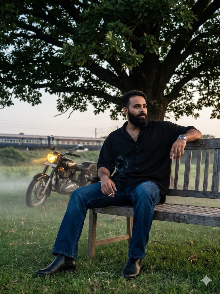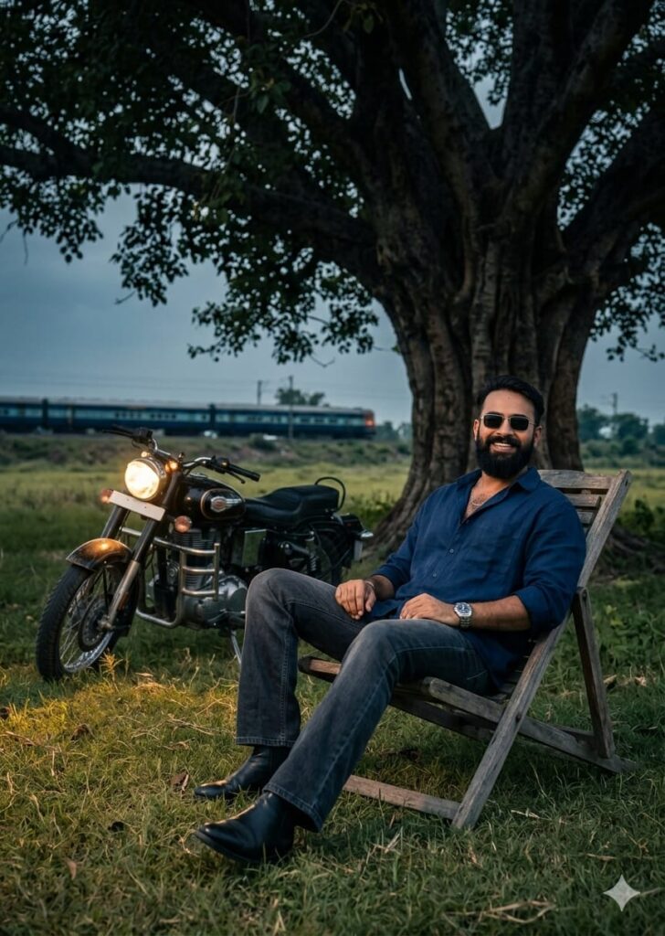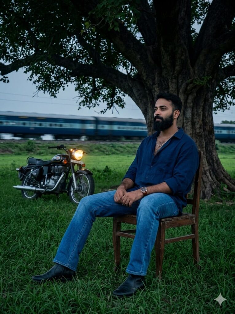 Cinematic 8K ultra-realistic photo of a handsome young man with a clear, detailed face sitting on a long wooden chair under a massive, sprawling ancient tree in a vast open field. He is wearing a stylish oversized casual shirt, bootcut jeans, a premium watch, and black boots. In the background, a train is passing by, creating a sense of motion. A Royal Enfield Bullet motorcycle is parked in the middle of the field at a distance with its headlight glowing brightly. The ground is covered in lush, vibrant green short grass. Side-angle camera shot, moody atmospheric lighting with a slightly dark background, soft cinematic light hitting the man’s face to ensure high clarity. Professional photography, sharp focus, 3:4 aspect ratio. Don’t change faces