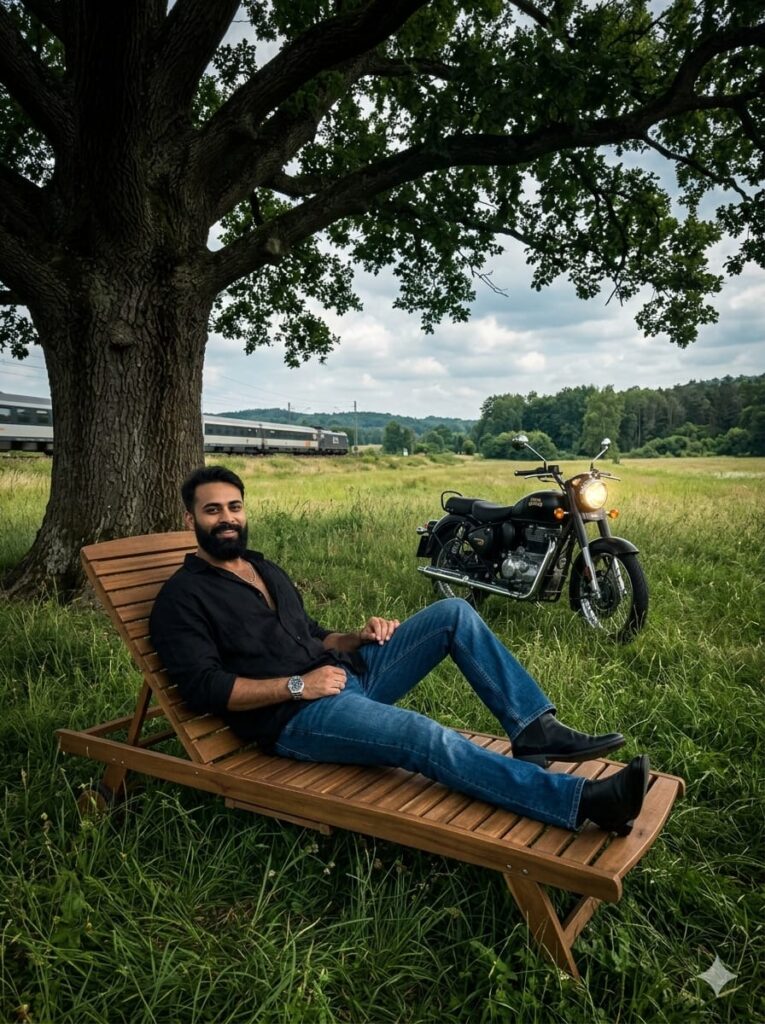 A hyper-realistic full-body shot of a confident young man with a clear, sharp face sitting on a long wooden lounge chair under a massive, ancient tree in a vast open field. He is leaning back comfortably, radiating confidence. He is wearing a stylish free-size (oversized) shirt, bootcut jeans, a premium watch, and black leather boots. Beside him, a classic Royal Enfield Bullet is parked with its headlight glowing brightly, casting a warm light. In the background, a train is passing by, adding a sense of motion. The ground is covered in lush, realistic green grass. The lighting is cinematic and moody with a slightly dark atmosphere, but with ultra-HD “face light” to ensure his features are perfectly clear and sharp. Side-angle view, 8k resolution, photorealistic, cinematic depth of field. –ar 3:4 don’t change faces