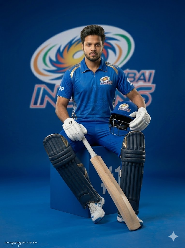 Create an ultra-realistic cinematic DSLR photograph recreating the SAME cricket-themed composition but now themed for MI (Mumbai Indians), with full-body visibility including shoes and seamless background-floor color matching, maintaining exact realism and ZERO AI or edited appearance. The subject is an 18-year-old handsome young man with a slim, lean physique. His face remains EXACTLY identical—no modification allowed. Hairstyle remains the same textured side-swept quiff with natural strands and volume. FRAMING & CAMERA: Full-body shot, vertical composition, slight low angle using a 50mm cinematic lens for premium cinematic feel. ASPECT RATIO • 3:4 vertical POSE (NEW – CROSS-LEG ELITE POSE): Subject seated on the box with one leg slightly crossed over the other. Cricket bat held diagonally across body resting on shoulder or lap. Helmet held in one hand resting lightly on knee. Body slightly angled with stylish posture. Feet fully visible and grounded. EXPRESSION: Serious confident expression with editorial attitude, eyes locked toward camera. OUTFIT (MI THEME): — Blue MI jersey with gold detailing — Matching trousers with natural folds — White gloves — Full cricket pads visible — Cricket shoes clearly visible with texture and grip PROPS: — Bat with visible wood grain — Helmet resting on knee — All gear ultra-realistic BOX (NO GLOW): — Matte blue box — Subtle white “#1” — Natural shadow beneath BACKGROUND + FLOOR (MATCHED COLOR): — Deep MI blue cinematic background — Seamless floor matching tone — Large MI logo centered behind (slight blur) LIGHTING: — Soft front key light — Slight top light — Rim light outlining subject — Smooth cinematic shadow falloff COLOR GRADING: Cool blue cinematic tones with rich contrast and depth. DEPTH OF FIELD: Subject fully sharp, background slightly blurred. FACE CLARITY — ULTRA HD MICRO DETAIL Face must be ultra-HD, crystal-clear with visible pores and exact identity preservation. STYLE Cinematic sports + fashion editorial poster, ultra-realistic DSLR look. IMPORTANT HARD RULE Must look 100% real human photograph. NEGATIVE PROMPT face distortion, blur face, CGI, cartoon, extra limbs, wrong anatomy, low quality TEXT / SIGNATURE Add “anupsagar.co.in” at the bottom-left corner, HANDWRITTEN SIGNATURE-STYLE typography, thin cursive strokes, small size, subtle premium elegance, white or soft off-white color.