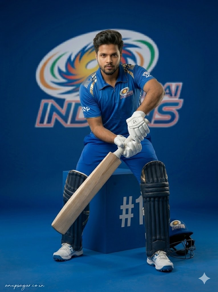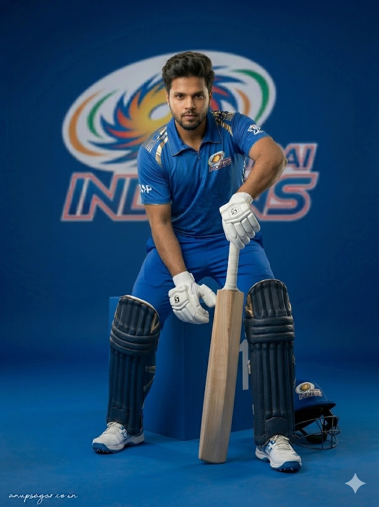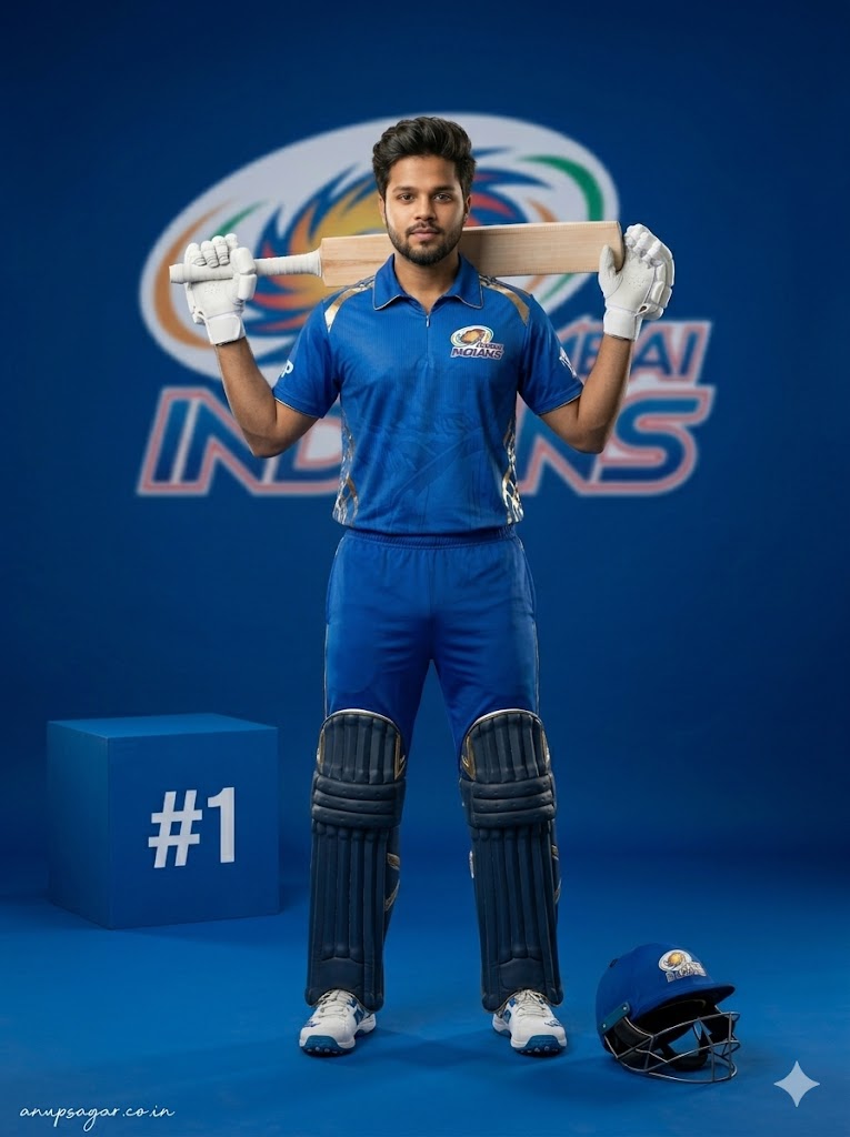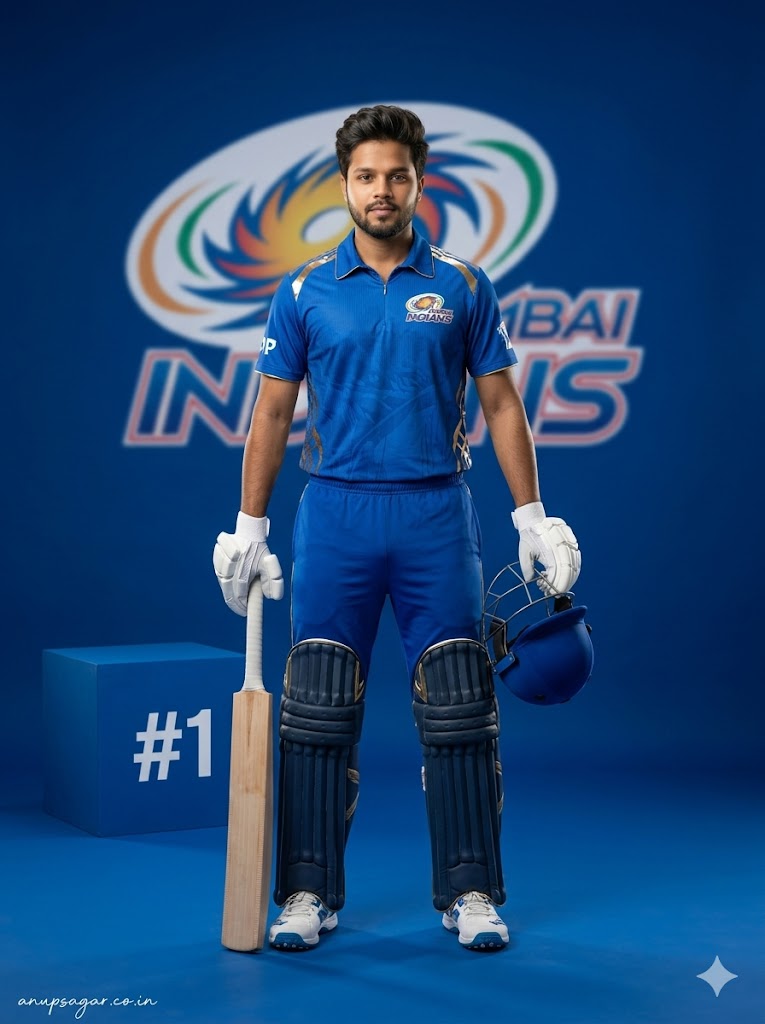 Create an ultra-realistic cinematic DSLR photograph recreating the SAME cricket-themed composition but now themed for MI (Mumbai Indians), with full-body visibility including shoes and seamless background-floor color matching, maintaining exact realism and ZERO AI or edited appearance. The subject is an 18-year-old handsome young man with a slim, lean physique, narrow shoulders and waist. His face remains EXACTLY identical—no modification in facial structure, pores, skin texture, beard, or identity. Hairstyle is strictly consistent: modern textured side-swept quiff with heavy natural volume, messy controlled strands, matte finish, softly blended sides (NO fade). FRAMING & CAMERA: Full-body shot (head to shoes fully visible), vertical composition, slightly low angle using a 50mm cinematic lens for a dominant hero perspective. ASPECT RATIO • 3:4 vertical POSE (NEW – BAT SHOULDER CHAMPION POSE): Standing upright with strong posture, legs slightly apart. Cricket bat resting across shoulders behind neck, both hands holding it from each side. Helmet placed on ground beside foot. Chest open and shoulders wide creating a powerful presence. EXPRESSION: Calm confident expression with strong leadership aura, eyes directly toward camera. OUTFIT (MI THEME): — Blue MI jersey with gold accents and realistic fabric texture — Matching blue trousers extending to ankles with natural folds — White batting gloves — Dark cricket pads fully visible — Cricket shoes (white/blue) clearly visible with detailed sole grip PROPS: — Bat resting on shoulders with visible wood grain — Helmet placed naturally on ground — Full cricket gear clearly visible BOX (NO GLOW): — Matte blue box placed slightly behind subject — Clean white “#1” marking — Natural shadow beneath BACKGROUND + FLOOR (MATCHED COLOR): — Deep MI blue cinematic background — Floor EXACT SAME tone (no visible line) — Matte surface with soft shadows — Large Mumbai Indians logo behind subject (slightly blurred for depth) LIGHTING: — Soft key light evenly illuminating subject — Subtle top light for depth — Rim light outlining subject edges — Smooth cinematic shadow falloff COLOR GRADING: Cool blue tones with subtle gold highlights and high contrast. DEPTH OF FIELD: Subject ultra sharp, background slightly blurred. FACE CLARITY — ULTRA HD MICRO DETAIL Face must be ultra-HD, razor sharp, crystal-clear with visible pores and exact identity preservation. STYLE Premium cricket poster, cinematic DSLR realism, hero aesthetic. IMPORTANT HARD RULE Must look like real photograph. NO AI artifacts. NEGATIVE PROMPT face change, blur face, CGI, cartoon, extra limbs, bad anatomy, low resolution TEXT / SIGNATURE Add “anupsagar.co.in” at the bottom-left corner, HANDWRITTEN SIGNATURE-STYLE typography, thin cursive strokes, small size, subtle premium elegance, white or soft off-white color.