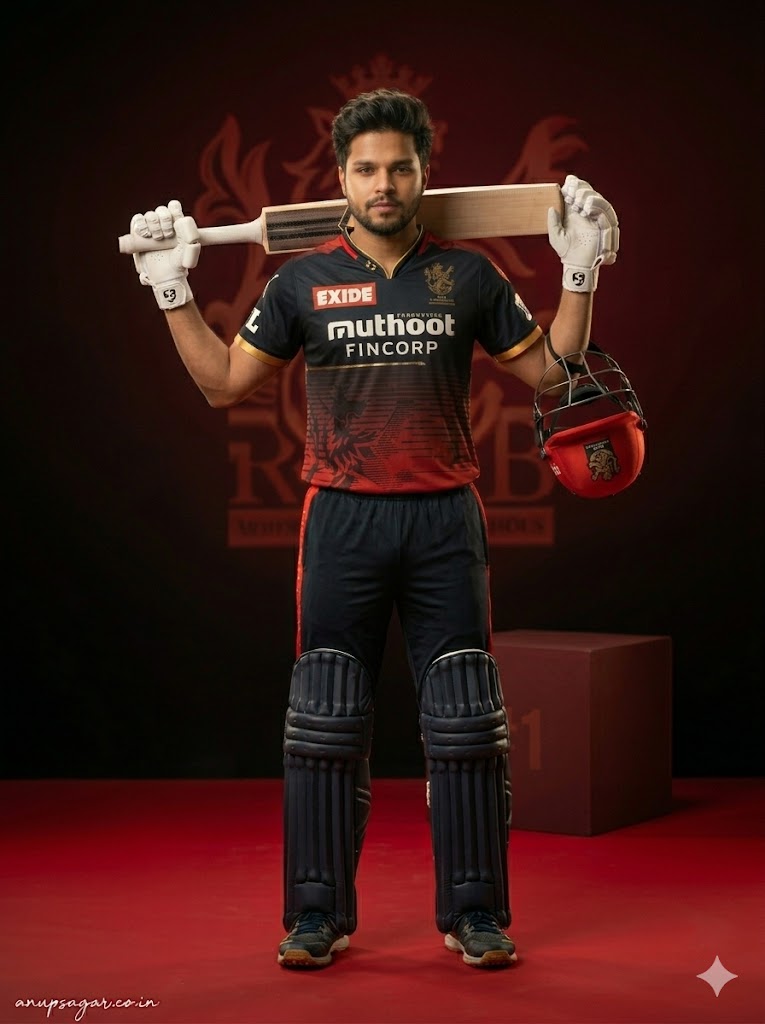 Create an ultra-realistic cinematic DSLR photograph recreating the SAME cricket-themed environment but now themed for RCB (Royal Challengers Bangalore) in a NEW dominant shoulder carry pose, maintaining full-body visibility including shoes and seamless background-floor color matching, with ZERO AI or edited appearance. The subject is an 18-year-old handsome young man with a slim, lean physique, narrow shoulders and waist. His face remains EXACTLY identical—no modification in facial structure, pores, skin texture, beard, or identity. Hairstyle is strictly consistent: modern textured side-swept quiff with heavy natural volume, messy controlled texture, visible strands, softly blended sides (NO fade, NO sharp cut). FRAMING & CAMERA: Full-body shot (head to shoes fully visible), vertical composition, slight low angle using 50mm cinematic lens for powerful perspective. ASPECT RATIO • 3:4 vertical POSE (NEW – SHOULDER POWER POSE): Standing upright with strong posture, legs slightly apart. Cricket bat placed across shoulders behind neck, both hands holding it from each side. Helmet hanging loosely from one wrist. Chest open and shoulders wide for dominant presence. EXPRESSION: Serious confident expression with strong athlete aura, eyes directly toward camera. OUTFIT (RCB THEME): — Black and red RCB jersey with gold accents (real fabric texture) — Matching trousers with natural folds — White batting gloves — Full cricket pads visible — Cricket shoes fully visible with grip detail PROPS: — Bat resting on shoulders with visible wood grain — Helmet hanging naturally — All gear realistic and detailed BOX (NO GLOW – MINIMAL PRESENCE): — Positioned slightly behind subject — Matte dark red tone — Subtle “#1” marking — Natural shadow on floor BACKGROUND + FLOOR (MATCHED COLOR): — Deep red-black cinematic background — Seamless floor (same color, no visible line) — Large RCB logo behind subject (slightly blurred) LIGHTING: — Strong front key light — Subtle top light for depth — Rim light highlighting edges — Balanced cinematic shadows COLOUR GRADING: Rich red-black tones with high contrast and cinematic depth. DEPTH OF FIELD: Shallow depth — subject fully sharp, background slightly blurred. FACE CLARITY — ULTRA HD MICRO DETAIL Face must be ultra-HD, razor sharp, crystal-clear with visible pores and exact identity match. STYLE High-end cricket poster, cinematic DSLR realism. IMPORTANT HARD RULE Must look like a real photograph. NO AI look. NEGATIVE PROMPT face change, identity mismatch, blur face, CGI, cartoon, extra limbs, bad anatomy, low resolution TEXT / SIGNATURE Add “anupsagar.co.in” at the bottom-left corner, HANDWRITTEN SIGNATURE-STYLE typography, thin cursive strokes, small size, subtle premium elegance, white or soft off-white color.