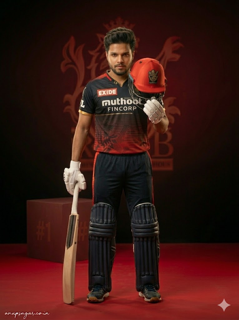 Create an ultra-realistic cinematic DSLR photograph recreating the SAME cricket-themed environment but now themed for RCB (Royal Challengers Bangalore) in a NEW helmet-focused stance, maintaining full-body visibility including shoes and seamless background-floor color matching, with ZERO AI or edited appearance. The subject is an 18-year-old handsome young man with a slim, lean physique. Face remains EXACTLY identical with no changes. Hairstyle remains the same textured side-swept quiff with natural volume and realistic strands. FRAMING & CAMERA: Full-body shot, vertical composition, slightly low angle using 50mm lens for strong cinematic framing. ASPECT RATIO • 3:4 vertical POSE (NEW – HELMET POWER POSE): Standing firmly with one leg slightly forward. Helmet held close to face at chest level with one hand, partially tilted outward. Bat held downward in the other hand, touching ground lightly. Body slightly angled toward camera. EXPRESSION: Intense focused expression, eyes locked forward, strong and fearless look. OUTFIT (RCB THEME): — Black-red jersey with gold detailing — Matching trousers with realistic folds — White gloves — Full cricket pads visible — Cricket shoes fully visible with texture detail PROPS: — Helmet held near chest with reflections — Bat grounded with visible wood grain — All equipment ultra-realistic BOX (NO GLOW – MINIMAL PRESENCE): — Slightly behind subject — Matte red tone — Subtle “#1” marking — Natural shadow BACKGROUND + FLOOR (MATCHED COLOR): — Deep red-black cinematic background — Seamless floor color match — Large RCB logo centered (slightly blurred) LIGHTING: — Dramatic front light — Soft top light — Rim light for separation — Controlled shadows for cinematic depth COLOUR GRADING: Warm red-black tones with high contrast and premium finish. DEPTH OF FIELD: Subject fully sharp, background slightly blurred. FACE CLARITY — ULTRA HD MICRO DETAIL Face must be ultra-HD, crystal-clear, with visible pores and exact identity preservation. STYLE Cinematic cricket poster, ultra-realistic DSLR photography. IMPORTANT HARD RULE Must look 100% real. NO artificial look. NEGATIVE PROMPT face distortion, blur face, CGI, cartoon, extra limbs, wrong proportions, low quality TEXT / SIGNATURE Add “anupsagar.co.in” at the bottom-left corner, HANDWRITTEN SIGNATURE-STYLE typography, thin cursive strokes, small size, subtle premium elegance, white or soft off-white color.