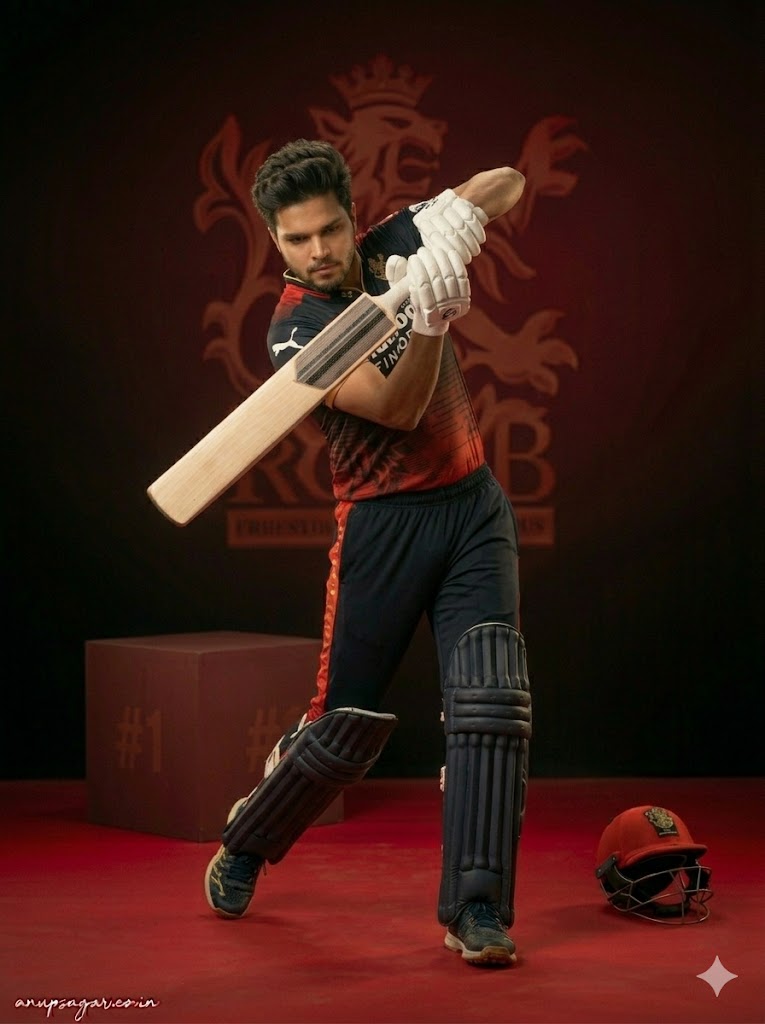 Create an ultra-realistic cinematic DSLR photograph recreating the SAME cricket-themed environment but now themed for RCB (Royal Challengers Bangalore) in a NEW victory stance pose, maintaining full-body visibility including shoes and seamless background-floor color matching, with ZERO AI or edited appearance. The subject is an 18-year-old handsome young man with a slim, lean physique. Face remains EXACTLY identical with no modification. Hairstyle remains the same textured side-swept quiff with natural volume and realistic strands. FRAMING & CAMERA: Full-body shot, vertical composition, slightly low angle using a 50mm lens for strong cinematic presence. ASPECT RATIO • 3:4 vertical POSE (NEW – VICTORY POWER POSE): Standing firmly with legs slightly apart. Bat held vertically grounded beside him with one hand resting on top of handle. Helmet held close to chest with other hand. Body upright with strong posture and open chest. EXPRESSION: Confident champion expression, slight intense look, eyes focused forward. OUTFIT (RCB THEME): — Black-red jersey with gold accents — Matching trousers with realistic folds — White gloves — Full cricket pads — Professional cricket shoes visible clearly PROPS: — Bat grounded with visible wood texture — Helmet close to chest — All equipment realistic BOX (NO GLOW – MINIMAL PRESENCE): — Positioned slightly behind subject — Matte dark red — White “#1” subtle — Natural shadow BACKGROUND + FLOOR (MATCHED COLOR): — Deep red-black cinematic background — Seamless floor same color — Large RCB logo centered behind (slight blur) — No visible floor line LIGHTING: — Strong key light from front — Subtle top light — Rim light for separation — Clean cinematic shadows COLOUR GRADING: Rich red-black tones with high contrast and premium cinematic feel. DEPTH OF FIELD: Subject fully sharp, background slightly blurred. FACE CLARITY — ULTRA HD MICRO DETAIL Face must be ultra-HD, crystal-clear, sharpest element with natural skin detail and exact identity. STYLE Professional cricket poster, cinematic DSLR realism. IMPORTANT HARD RULE Must look 100% real. NO artificial look. NEGATIVE PROMPT face distortion, wrong proportions, blur face, CGI, cartoon, low quality, extra limbs TEXT / SIGNATURE Add “anupsagar.co.in” at the bottom-left corner, HANDWRITTEN SIGNATURE-STYLE typography, thin cursive strokes, small size, subtle premium elegance, white or soft off-white color.