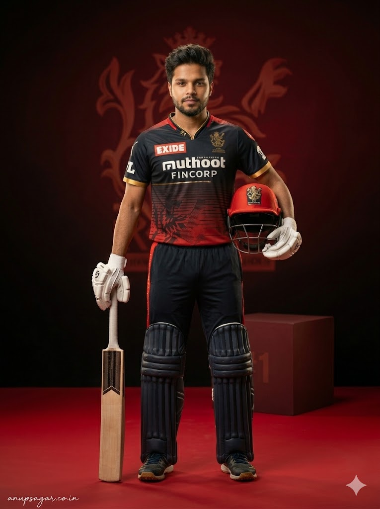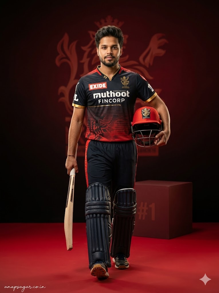 Create an ultra-realistic cinematic DSLR photograph recreating the SAME cricket-themed environment but now themed for RCB (Royal Challengers Bangalore) in a NEW walking power pose, maintaining full-body visibility including shoes and seamless background-floor color matching, with ZERO AI or edited appearance. The subject is an 18-year-old handsome young man with a slim, lean physique, narrow shoulders and waist. His face remains EXACTLY identical—no modification in facial structure, pores, skin texture, beard, or identity. Hairstyle is strictly consistent: modern textured side-swept quiff with heavy natural volume on top, deep side flow, messy yet controlled texture, soft matte finish, visible natural strands, softly blended sides (NO hard fade, NO clean cut). FRAMING & CAMERA: Full-body shot (head to shoes fully visible), vertical composition. Slight low angle using a 50mm cinematic lens to enhance dominance and presence. ASPECT RATIO • 3:4 vertical POSE (NEW – WALKING POWER POSE): The subject is walking forward toward the camera with one foot stepping ahead, body slightly leaning forward. Cricket bat held down in one hand near thigh level, angled slightly backward. Helmet carried in the other hand swinging naturally. EXPRESSION: Focused intense expression with strong athlete confidence, eyes locked directly on camera. OUTFIT (RCB THEME): — Black and red RCB jersey with gold accents, ultra-realistic fabric — Matching trousers with red highlights and natural folds — White batting gloves — Dark cricket pads fully visible — Cricket shoes clearly visible with sole and grip detail PROPS: — Cricket bat with visible wood grain and grip texture — Helmet held naturally with realistic reflections — Full gear visible clearly BOX (NO GLOW – MINIMAL PRESENCE): — Placed behind subject subtly — Matte dark red tone — White “#1” faintly visible — Natural floor shadow BACKGROUND + FLOOR (MATCHED COLOR): — Deep red and black cinematic background — Floor EXACT SAME tone (no visible line) — Matte texture with realistic shadows — Large RCB logo behind subject (slightly blurred for depth) LIGHTING: — Soft key light evenly illuminating full body — Top light for depth — Subtle rim light separating subject — Balanced cinematic shadows COLOUR GRADING: Warm red-black cinematic tone with high contrast and natural skin preservation. DEPTH OF FIELD: Shallow depth—subject fully sharp, background slightly blurred. FACE CLARITY — ULTRA HD MICRO DETAIL Face must be ultra-HD, razor sharp with visible pores, natural texture, and perfect identity match. STYLE Premium cricket poster, cinematic realism, DSLR photography. IMPORTANT HARD RULE Must look like real photograph. NO AI look. NEGATIVE PROMPT face change, identity mismatch, blur face, CGI, cartoon, extra limbs, bad anatomy, low resolution TEXT / SIGNATURE Add “anupsagar.co.in” at the bottom-left corner, HANDWRITTEN SIGNATURE-STYLE typography, thin cursive strokes, small size, subtle premium elegance, white or soft off-white color.