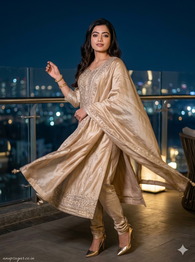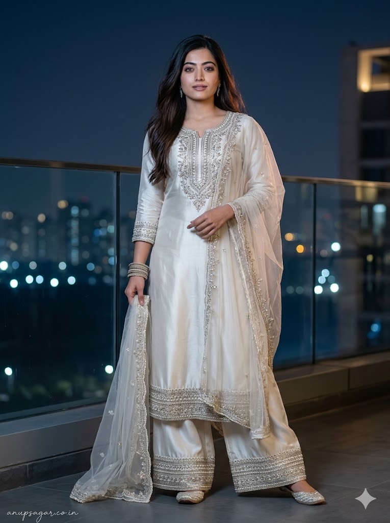 Create a full-body ultra-realistic cinematic portrait of a graceful woman standing on a luxury rooftop terrace at night under soft moonlight, designed with a high-end fashion editorial vibe and ultra-HD face clarity. FACE LOCK — ZERO MODIFICATION POLICY Use the uploaded reference image for the woman’s face. Face must remain 100% identical. Preserve exact eyes, nose, lips, cheeks, skin tone, and proportions. No beautification, no smoothing, no reshaping. FACE CLARITY PRIORITY Face must be ultra-HD sharp, crystal-clear with natural skin texture, visible pores, and realistic lighting. No blur or artificial smoothing. Face must be the sharpest element. ASPECT RATIO • 3:4 vertical STYLE Ultra-realistic high-end fashion photography, cinematic night aesthetic, luxury editorial look, 8K ultra detail. SCENE A modern rooftop with glass railing, city skyline silhouettes, soft moonlight illuminating the scene, and subtle ambient lighting from nearby buildings. POSE • Standing tall with one leg slightly forward • One hand gently holding the edge of dupatta • Other hand resting naturally near waist • Slight body angle with confident posture EXPRESSION Calm confident expression with soft elegance and composed gaze. OUTFIT Luxurious ivory-white silk salwar kameez with a glossy satin finish • Heavy silver and pearl embroidery on neckline, sleeves, and hem • Wide-leg trousers with intricate border work • Sheer net dupatta with delicate embroidered edges JEWELLERY • Silver bangles stacked on wrist • Minimal elegant earrings FOOTWEAR • Metallic silver pointed-toe heels HAIR • Long silky hair styled softly with natural flow LIGHTING • Soft moonlight highlighting face and outfit • Subtle rim light on hair and shoulders • Balanced shadows for depth BACKGROUND • City skyline silhouettes • Soft glowing lights from buildings • Slight blur for cinematic depth CAMERA & COMPOSITION • DSLR 85mm lens • Full-body portrait framing • Slight low-angle fashion shot • Face ultra sharp, background softly blurred NEGATIVE PROMPT face blur, identity change, plastic skin, CGI look, distorted anatomy, extra limbs, overexposed lighting, cartoon effect TEXT / SIGNATURE Add “anupsagar.co.in” at the bottom-left corner, HANDWRITTEN SIGNATURE-STYLE typography, thin cursive strokes, small size, subtle premium elegance, white or soft off-white color.