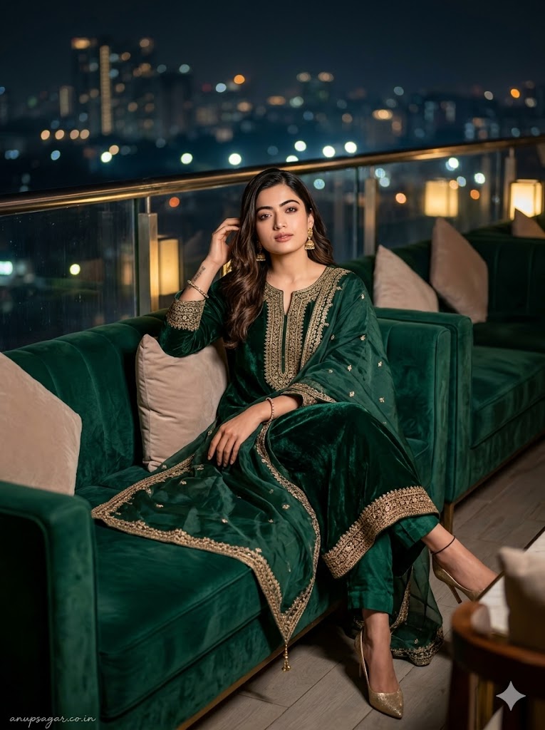Create a full-body ultra-realistic cinematic portrait of a graceful woman sitting elegantly on a luxury rooftop lounge at night under soft ambient lighting, designed with a premium fashion editorial aesthetic and ultra-HD face clarity. FACE LOCK — ZERO MODIFICATION POLICY Use the uploaded reference image for the woman’s face. Face must remain 100% identical. Preserve exact eyes, nose, lips, cheeks, skin tone, and proportions. No beautification, no smoothing, no reshaping. FACE CLARITY PRIORITY Face must be ultra-HD sharp, crystal-clear with natural skin texture, visible pores, and realistic lighting. No blur or smoothing. Face must be the sharpest element. ASPECT RATIO • 3:4 vertical STYLE Ultra-realistic high-end fashion photography, cinematic luxury editorial style, 8K ultra detail. SCENE A premium rooftop lounge setup with velvet seating, soft cushions, glass railing, and a blurred city skyline glowing in the background at night. POSE • Sitting gracefully on a velvet sofa • One leg slightly crossed over the other • One hand resting on knee • Other hand gently touching hair • Relaxed yet elegant posture EXPRESSION Calm, poised, and confident expression with soft eyes and natural elegance. OUTFIT Deep emerald green velvet salwar kameez with a soft matte-gloss texture • Intricate antique gold embroidery on neckline, cuffs, and hem • Straight-cut trousers with subtle detailing • Sheer organza dupatta with embroidered borders JEWELLERY • Statement gold earrings • Minimal bangles FOOTWEAR • Elegant gold heels HAIR • Smooth silky hair styled with soft waves LIGHTING • Soft warm rooftop lighting • Gentle highlights on face and outfit • Subtle rim light on hair BACKGROUND • Blurred city skyline with glowing lights • Rooftop lounge details • Depth with soft bokeh CAMERA & COMPOSITION • DSLR 85mm lens • Slight side-angle fashion shot • Full-body composition • Ultra sharp face with shallow depth-of-field NEGATIVE PROMPT face blur, identity change, plastic skin, CGI look, distorted anatomy, extra limbs, overexposed lighting, cartoon effect TEXT / SIGNATURE Add “anupsagar.co.in” at the bottom-left corner, HANDWRITTEN SIGNATURE-STYLE typography, thin cursive strokes, small size, subtle premium elegance, white or soft off-white color.