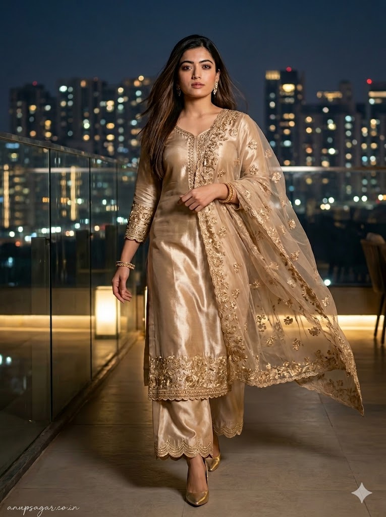 Create a full-body ultra-realistic cinematic portrait of a graceful woman walking confidently on a rooftop at night, designed with a luxury fashion runway vibe and ultra-HD face clarity. FACE LOCK — ZERO MODIFICATION POLICY Use the uploaded reference image for the woman’s face. Face must remain 100% identical. Preserve exact facial structure, skin tone, eyes, nose, lips, and identity. No beautification or alteration. FACE CLARITY PRIORITY Face must be ultra-HD sharp with natural skin texture, visible pores, and crisp detail. No blur, no smoothing. Face must be the primary focus. ASPECT RATIO • 3:4 vertical STYLE Ultra-realistic cinematic fashion photography, luxury editorial + runway aesthetic, 8K ultra detail. SCENE A premium rooftop terrace with city lights glowing in the background, glass railings reflecting light, and soft night ambiance. POSE • Walking forward in a confident runway-style stride • One hand slightly lifting dupatta • Other hand swinging naturally • Fabric flowing slightly with motion EXPRESSION Strong confident expression with elegant attitude and poise. OUTFIT Rich champagne-gold metallic silk salwar kameez with high-gloss satin finish • Heavy gold zari floral embroidery on borders and sleeves • Wide-leg trousers with detailed scalloped hem • Sheer net dupatta with embroidered floral patterns JEWELLERY • Gold bangles and subtle statement earrings FOOTWEAR • Golden pointed heels HAIR • Smooth long hair flowing slightly with movement LIGHTING • Soft cinematic lighting mixed with city glow • Gentle highlights on face and outfit • Controlled shadows for depth BACKGROUND • Blurred city skyline with glowing lights • Rooftop elements reflecting light • Slight motion effect in fabric only CAMERA & COMPOSITION • DSLR 50mm lens • Full-body vertical framing • Slight forward motion capture • Face ultra sharp with depth-of-field NEGATIVE PROMPT face blur, identity mismatch, plastic skin, CGI look, distorted body, extra fingers, low detail, unrealistic lighting TEXT / SIGNATURE Add “anupsagar.co.in” at the bottom-left corner, HANDWRITTEN SIGNATURE-STYLE typography, thin cursive strokes, small size, subtle premium elegance, white or soft off-white color.