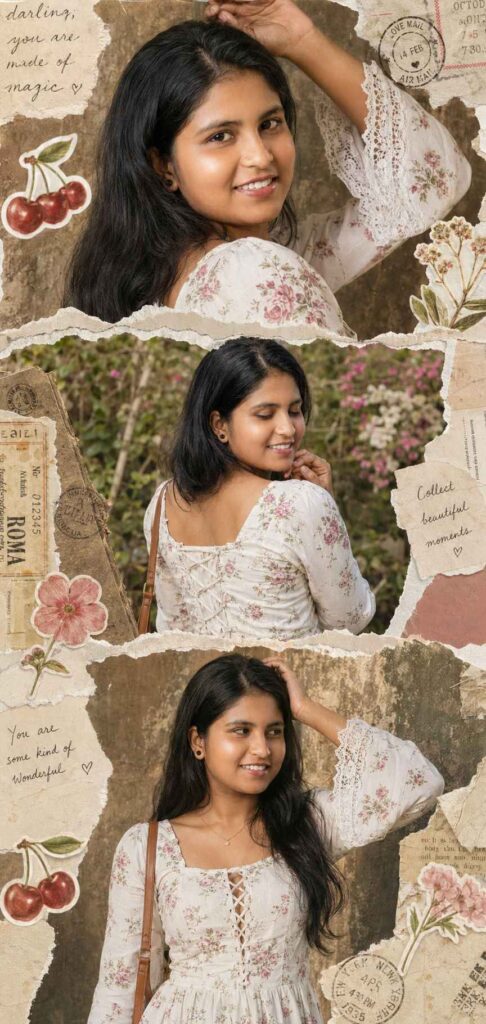 A high-definition vertical collage with a vintage scrapbook aesthetic, featuring three distinct panels of a woman with long, wavy dark hair. She is wearing a black floral-print dress with bell sleeves and an intricate lace-up corset detail on the back. The panels are separated by realistic white torn-paper edges. The background is filled with nostalgic elements: aged parchment paper, botanical sketches of white flowers, vintage postage stamps, and handwritten cursive notes like “darling, you’re different.” The lighting is warm and soft with a subtle film grain and light leaks, creating a dreamy, 90s-inspired cinematic mood. with same face & vertical