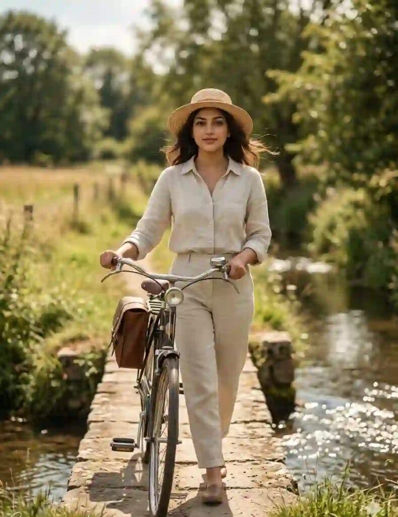 Create an ultra-realistic 8K cinematic vintage summer portrait (use the uploaded reference image for exact face, identity, and skin tone), designed with extreme face clarity, soft natural lighting, and a peaceful nostalgic atmosphere. FACE LOCK — ZERO MODIFICATION POLICY Use the uploaded reference image as the exact facial identity source. Face must remain 100% identical. Preserve exact facial structure, jawline, cheekbones, nose, lips, and natural skin tone. No beautification, no smoothing, no reshaping. FACE CLARITY — EXTREME HD MASTER PRIORITY Face must be razor-sharp, ultra-HD, crystal-clear with visible pores, fine skin texture, and natural micro-details. No blur, no softness, no glow distortion. Face must be the sharpest element in the entire image. ASPECT RATIO • 3:4 vertical STYLE Ultra-realistic DSLR photography, cinematic vintage summer aesthetic, 8K ultra detail, RAW clarity. SCENE A small rustic stone bridge over a narrow flowing stream, surrounded by greenery, soft grass, and summer trees creating a peaceful countryside vibe. POSE • Walking slowly across the bridge • One hand lightly holding a vintage bicycle beside • Head slightly turned toward water • Natural mid-step motion (fully sharp, no blur) EXPRESSION • Calm thoughtful expression • Slight soft smile • Relaxed nostalgic mood OUTFIT • Light vintage summer outfit • Linen shirt + trousers • Straw sun hat PROPS & DETAILS • Vintage bicycle with bell and leather side bag • Realistic metal and leather textures HAIR • Natural hairstyle • Slight movement from breeze LIGHTING • Bright natural sunlight • Reflections on water surface • Clean highlights on face (NO blur) COLOR GRADING • Warm golden tones • Slight vintage color fade • Soft cinematic finish BACKGROUND • Flowing water • Trees and grass • Slight blur for depth CAMERA & COMPOSITION • DSLR 85mm lens • Wide cinematic frame • Face-focused ultra sharp rendering MOOD & TONE • Peaceful • Nostalgic • Natural • Summer calm NEGATIVE PROMPT face blur, motion blur on face, identity change, plastic skin, CGI look, distortion, over-smoothing, low resolution TEXT / SIGNATURE Add “Geminiaiprompt.in” at the bottom-left corner, HANDWRITTEN SIGNATURE-STYLE typography, thin cursive strokes, small size, subtle premium elegance, white or soft off-white color.