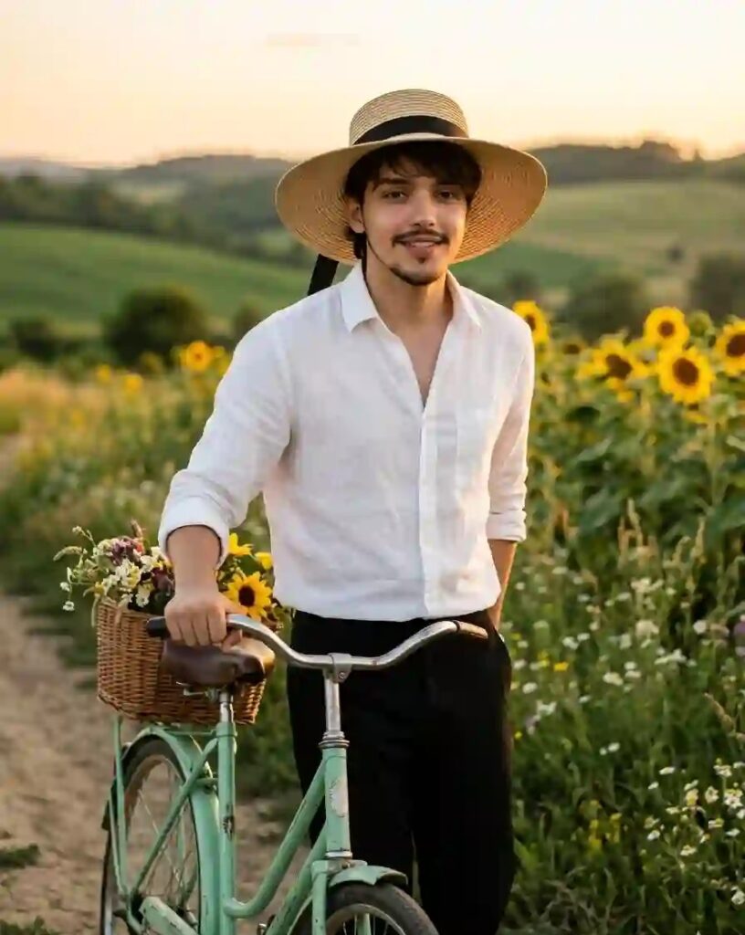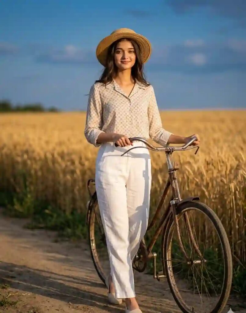 Create an ultra-realistic 8K cinematic rural lifestyle portrait (use the uploaded reference image for exact face, identity, and skin tone), designed with extreme face clarity, natural textures, and a warm vintage countryside aesthetic. FACE LOCK — ZERO MODIFICATION POLICY Use the uploaded reference image as the exact facial identity source. Face must remain 100% identical. Preserve exact facial structure, jawline, cheekbones, nose, lips, and natural skin tone. No beautification, no smoothing, no reshaping. FACE CLARITY — EXTREME HD MASTER PRIORITY Face must be razor-sharp, ultra-HD, crystal-clear with visible pores, fine skin texture, and micro-details. No blur, no softness, no glow distortion. Face must be the sharpest element in the entire image. ASPECT RATIO • 3:4 vertical STYLE Ultra-realistic DSLR photography, cinematic countryside aesthetic, vintage lifestyle look, 8K ultra detail, RAW clarity. SCENE A vast golden wheat field beside a dusty rural road, glowing under warm golden hour sunlight, with a deep blue sky and soft clouds. POSE • Walking slowly along the road • One hand lightly holding a vintage bicycle • Other hand relaxed • Natural mid-step movement EXPRESSION • Calm confident expression • Slight natural smile • Direct eye contact with camera OUTFIT • Vintage patterned shirt • Light trousers • Stylish summer hat BICYCLE DETAILS • Classic vintage bicycle • Slightly rustic texture • Leaning naturally beside subject HAIR • Natural hairstyle under hat • Soft realistic strands LIGHTING • Golden hour sunlight • Warm highlights on face • Balanced shadows COLOR GRADING • Warm golden tones • Deep blue sky contrast • Vintage cinematic finish BACKGROUND • Wheat field stretching into distance • Dusty road • Slight blur for depth CAMERA & COMPOSITION • DSLR 85mm lens • Slight low-angle cinematic shot • Face-focused ultra sharp rendering • Motion freeze (NO blur on subject) MOOD & TONE • Warm • Peaceful • Vintage • Natural NEGATIVE PROMPT face blur, motion blur on face, identity change, plastic skin, CGI look, distortion, over-smoothing, low resolution TEXT / SIGNATURE Add “Geminiaiprompt.in” at the bottom-left corner, HANDWRITTEN SIGNATURE-STYLE typography, thin cursive strokes, small size, subtle premium elegance, white or soft off-white color.
