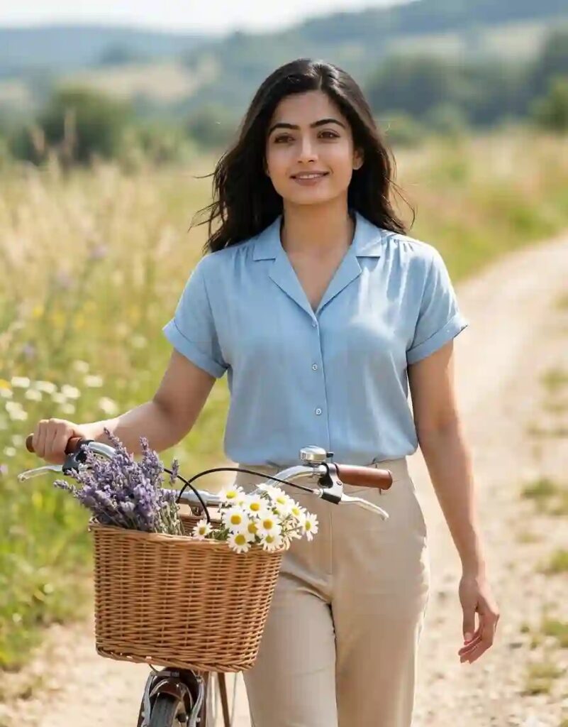 Create an ultra-realistic 8K cinematic summer countryside portrait (use the uploaded reference image for exact face, identity, and skin tone), designed with extreme face clarity, natural textures, and vintage aesthetic mood. FACE LOCK — ZERO MODIFICATION POLICY Use the uploaded reference image as the exact facial identity source. Face must remain 100% identical. Preserve exact facial structure, jawline, cheekbones, nose, lips, and natural skin tone. No beautification, no smoothing, no reshaping. FACE CLARITY — EXTREME HD MASTER PRIORITY Face must be razor-sharp, ultra-HD, crystal-clear with visible pores, fine skin texture, and micro-details. No blur, no softness, no glow distortion. Face must be the sharpest element in the entire image. ASPECT RATIO • 3:4 vertical STYLE Ultra-realistic DSLR lifestyle photography, vintage summer aesthetic, 8K ultra detail, RAW clarity. SCENE A peaceful countryside road surrounded by tall grass, wildflowers, and soft summer breeze under bright natural sunlight. POSE • Walking slowly while holding bicycle beside • One hand on handlebar • Other hand relaxed • Slight forward movement captured naturally EXPRESSION • Soft relaxed smile • Calm dreamy expression • Looking slightly toward horizon OUTFIT • Light blue retro-style shirt • Casual trousers • Vintage summer styling BICYCLE & PROPS • Classic bicycle with brown leather seat • Front wicker basket filled with lavender and daisies • Natural placement of flowers HAIR • Natural hairstyle • Slight movement from breeze LIGHTING • Bright summer sunlight • Soft highlights on face • Natural shadow balance COLOR GRADING • Warm summer tones • Vibrant greens + soft pastel colors • Cinematic finish BACKGROUND • Country road • Tall grass and flowers • Soft blur for depth CAMERA & COMPOSITION • DSLR 85mm lens • Slight cinematic angle • Face-focused ultra sharp rendering • Motion freeze (NO blur on subject) MOOD & TONE • Peaceful • Nostalgic • Natural • Summer aesthetic NEGATIVE PROMPT face blur, identity change, plastic skin, CGI look, distortion, over-smoothing, low resolution TEXT / SIGNATURE Add “Geminiaiprompt.in” at the bottom-left corner, HANDWRITTEN SIGNATURE-STYLE typography, thin cursive strokes, small size, subtle premium elegance, white or soft off-white color.