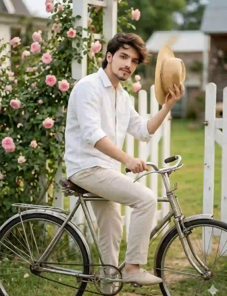 Create an ultra-realistic 8K cinematic countryside portrait (use the uploaded reference image for exact face, identity, and skin tone), designed with extreme face clarity, natural textures, and a soft farmhouse aesthetic. FACE LOCK — ZERO MODIFICATION POLICY Use the uploaded reference image as the exact facial identity source. Face must remain 100% identical. Preserve exact facial structure, jawline, cheekbones, nose, lips, and natural skin tone. No beautification, no smoothing, no reshaping. FACE CLARITY — EXTREME HD MASTER PRIORITY Face must be razor-sharp, ultra-HD, crystal-clear with visible pores, fine skin texture, and micro-details. No blur, no softness, no glow distortion. Face must be the sharpest element in the entire image. ASPECT RATIO • 3:4 vertical STYLE Ultra-realistic DSLR lifestyle photography, cinematic countryside aesthetic, 8K ultra detail, RAW clarity. SCENE A charming farmhouse entrance with a white wooden gate, rose-covered fence, green grass, and blooming flowers creating a peaceful rural environment. POSE • Sitting on a classic bicycle just stopped near the gate • One foot touching ground for balance • One hand holding the handlebar • Other hand holding a straw hat to prevent it from flying • Slight body lean forward (motion just stopped) EXPRESSION • Natural relaxed expression • Soft happy look • Eyes clear and sharp OUTFIT • Light casual countryside outfit (shirt + trousers or dressy casual) • Natural rustic styling BICYCLE DETAILS • Vintage/classic bicycle • Metal frame with realistic reflections • Detailed spokes, chain, and seat texture PROPS • Straw sun hat with realistic woven texture • Rose plants around fence HAIR • Natural hairstyle • Slight motion effect from movement LIGHTING • Bright natural daylight • Soft shadows • Face clearly visible (NO blur) COLOR GRADING • Fresh green + warm tones • Soft cinematic countryside look BACKGROUND • White fence • Rose plants • Farmhouse elements • Slight blur depth CAMERA & COMPOSITION • DSLR 85mm lens • Slight side-angle cinematic shot • Face-focused ultra sharp rendering MOOD & TONE • Peaceful • Fresh • Natural • Countryside vibe NEGATIVE PROMPT face blur, motion blur on face, identity change, plastic skin, CGI look, distorted bicycle, low resolution TEXT / SIGNATURE Add “Geminiaiprompt.in” at the bottom-left corner, HANDWRITTEN SIGNATURE-STYLE typography, thin cursive strokes, small size, subtle premium elegance, white or soft off-white color.